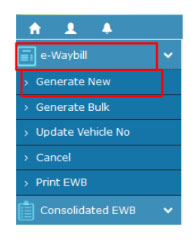 Then a page opens up which has the ‘e-waybill’ option on the left-hand side of the dashboard, wherein the drop-down list appears where you have to click on the ‘Generate new’ to receive the format of the E-way bill form i.e. EWB 01.